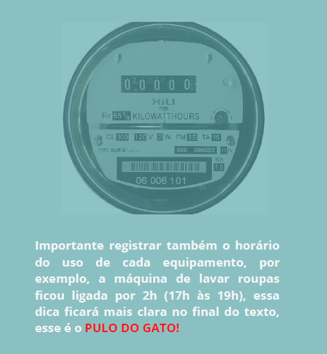 Estabeleça um horário para fazer a leitura no seu medidor de energia, por exemplo, sempre às 10h realize a leitura do relógio. No dia seguinte faça novamente o registro do valor no mesmo horário. Basta subtrair o valor atual pelo valor do dia anterior que terá o valor do consumo das últimas 24h. Procure anotar quais equipamentos e por quanto tempo foram utilizados. Por exemplo, o tempo que a máquina de lavar estava em funcionamento, ou quanto tempo o ferro de passar roupas foi utilizado.