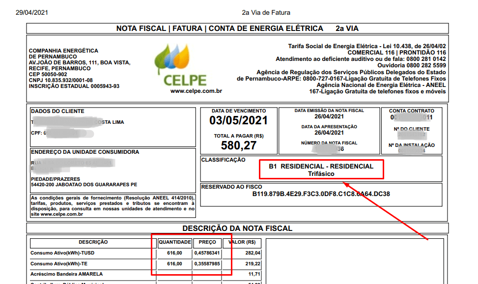 Antes de falar sobre a energia solar, vamos analisar – utilizando um exemplo real – as despesas acumulados por uma família brasileira composta por 4 pessoas, com uma despesa mensal média de 500KWh/mês (quinhentos quilowatts-hora por mês) na Cidade de Recife – PE, em Abril de 2021 e que não utiliza a geração solar fotovoltaica como fonte de energia.